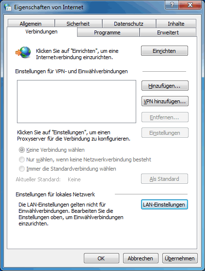 - Wechsle zur Karteikarte "Verbindungen" und klicke auf die Schaltfläche "LAN-Einstellungen".