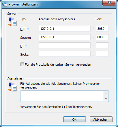 - Trage in die Felder neben "HTTP:" die Adresse "127.0.0.1" ein und als Port "8080". Falls dort bereits Einträge stehen, dann notiere sie dir, weil du sie später vielleicht als externen Proxy in Proxomitron eintragen musst.